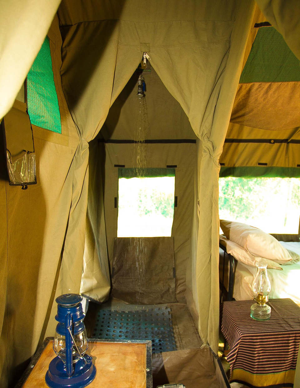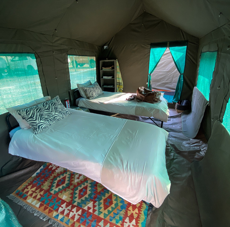 All bedding is supplied and includes: a comfortable camp bed, mattress, duvet, blankets, pillows, towels, bedside table, and paraffin lamp.
